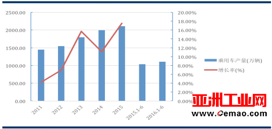 2015 年(nian),全國汽車産銷量(liang)分别為 2,450 萬輛和 2,460 萬(wàn)輛, 同比增長 3.29%和 4.68%。其(qi)🌂中,乘用車産銷量(liang)分别為 2,108 萬輛和 2,114 萬(wàn)輛,同比增長 5.82%和🈲 7.30%;商(shāng)用車産銷量分别(bié)💞為 342 萬輛和 345 萬輛,同(tóng)比下降分别為 9.97%和(hé) 8.97%。 2016 年上半年,全🌈國汽(qi)車産銷量分别為(wéi) 1,287 萬輛💃🏻和 1,279 萬輛,同比(bǐ)增長 6.41%和 8.10%。其中,乘用(yong)⛹🏻♀️車産銷量分别為(wéi) 1,108 萬🏃🏻輛和 1,101 萬輛,同比(bǐ)增長 7.25%和 9.23%;商用車産(chǎn)銷量分别為 179 萬輛(liang)🏃♂️和 179 萬輛,同比⛹🏻♀️下降(jiàng)分别為 1.53%和 1.62%。2011 年至 2016 年(nian) 1-6 月乘用車✏️産量及(ji)增長率情況如下(xia):