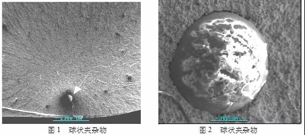 實(shi)例:某公司一件(jiàn)型号為SY6480(Ф22mm)的車輛(liàng)懸架用扭杆彈(dan)簧,在新車出庫(kù)時便發生斷裂(lie),分析認為斷裂(lie)起源于彈簧亞(yà)表面存🔅在的一(yi)個粗大脆性夾(jia)雜物(如圖1,圖2(圖(tú)1的放大圖))。