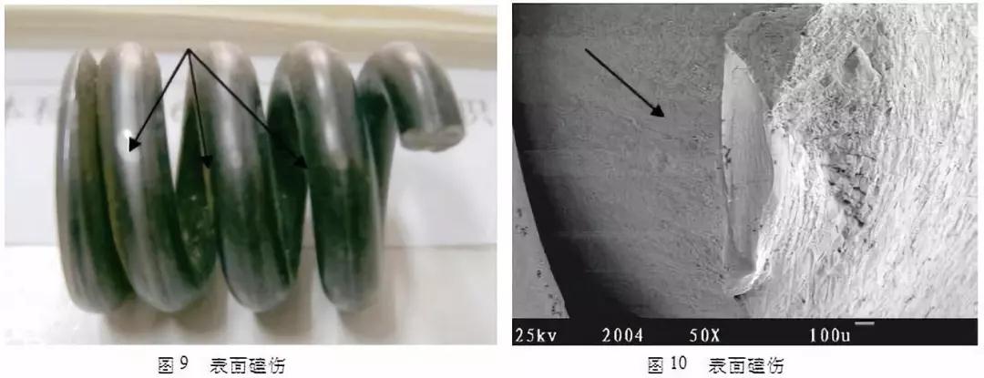 彈(dan)簧因為表面磕(ke)痕、凹坑等引起(qi)彈簧失效的情(qing)況很🤩多,在失效(xiao)件中占很大比(bǐ)例。如某公司離(li)合器從♈動盤彈(dan)簧由于彈簧表(biao)面存在的嚴重(zhòng)磕傷而導緻它(tā)過早疲勞斷裂(lie)(如圖9,圖10)。這種表(biao)面缺💞陷可能發(fā)生在彈簧制🈲造(zao)過程中,也可能(néng)在使用過程🚩中(zhong)磕碰産生,制造(zào)過程前面已述(shu),而在使用過程(cheng)📱,使用者要檢♊查(chá)使用環境,避免(mian)彈簧受碰撞等(deng)。